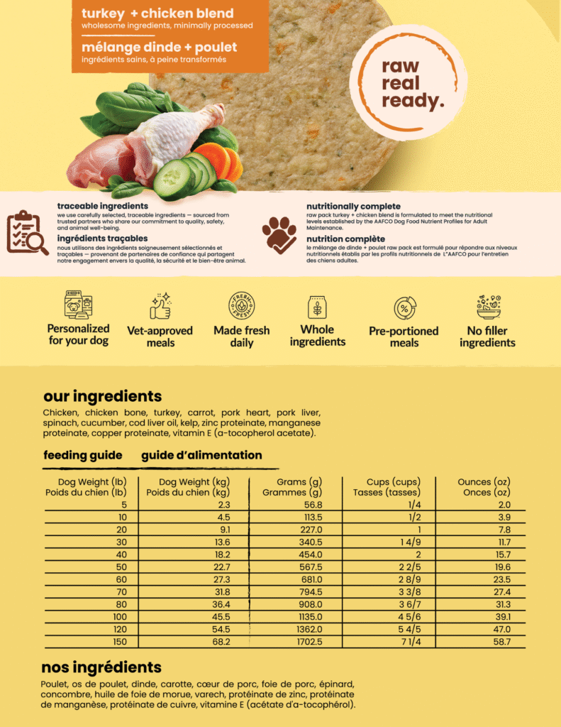 Raw Pack chicken and turkey blends are made from a mix of whole birds and carcasses, all locally sourced in Canada. We’re proud to support the Canadian poultry industry, which contributes significantly to the economy and helps sustain over 112,000 jobs nationwide.